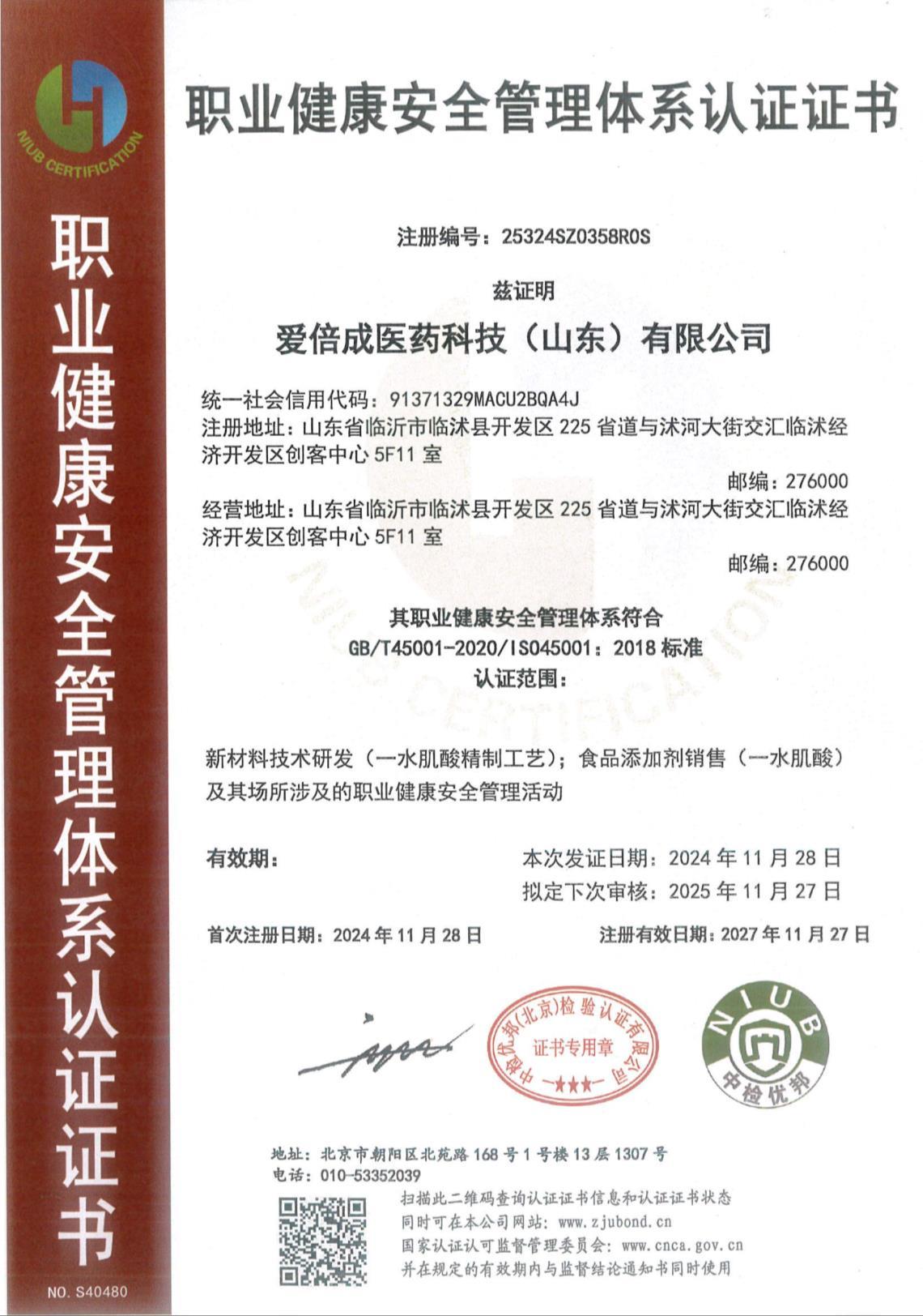 职业健康安全管理体系证书
