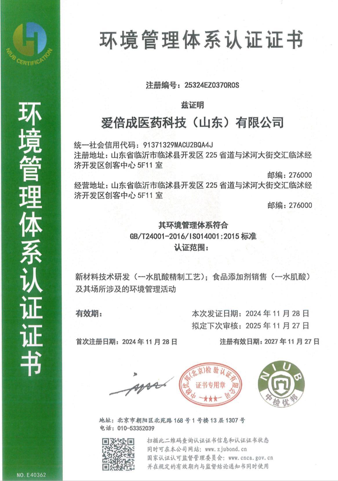 环境管理体系认证证书