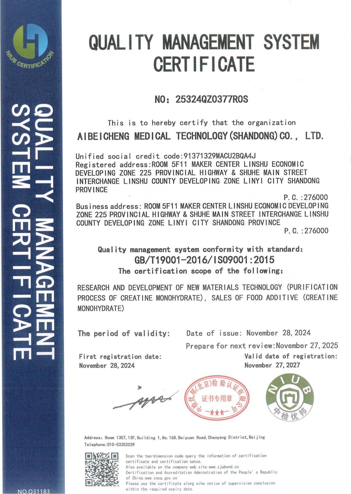 质量管理体系认证证书