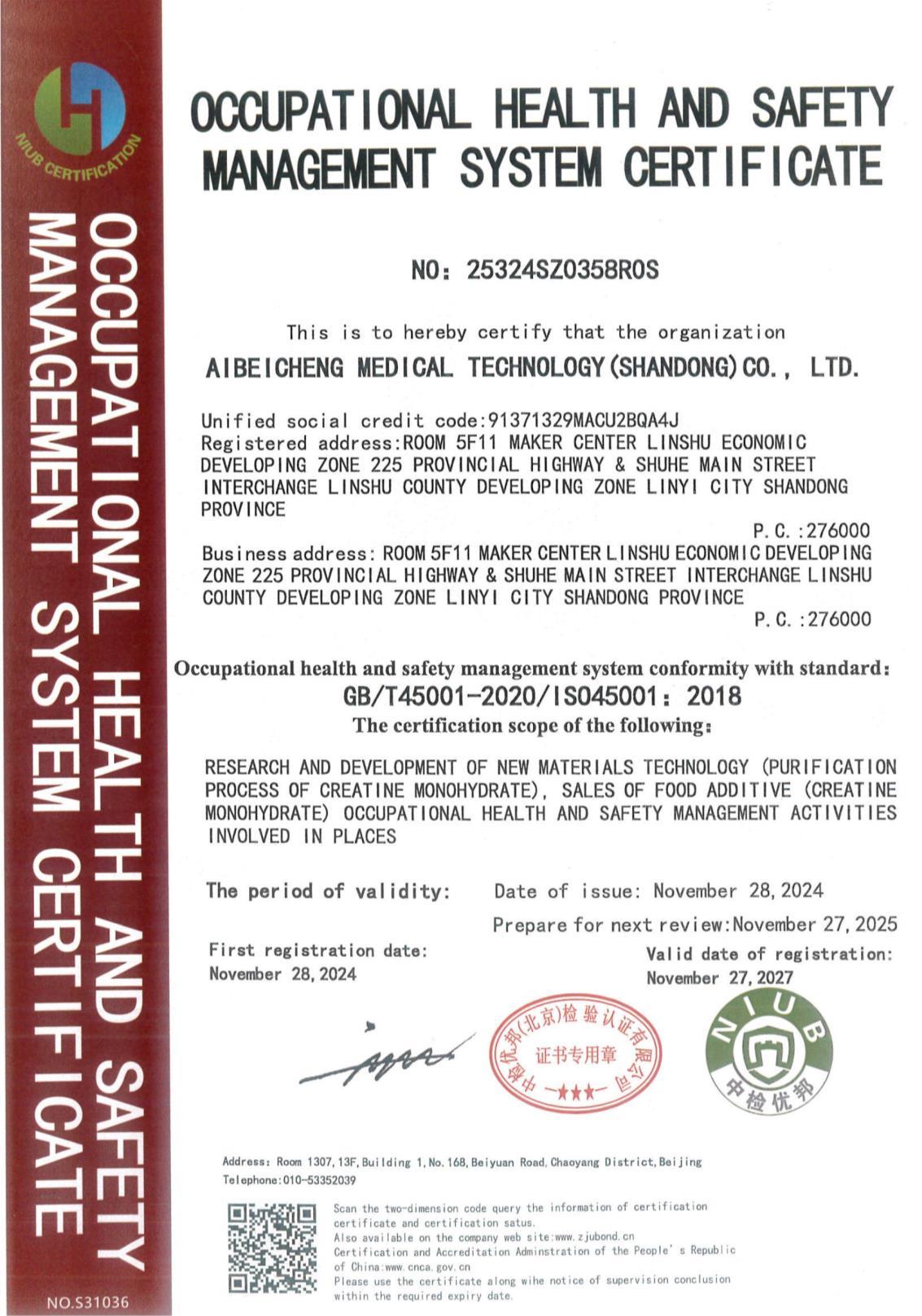 职业健康安全管理体系证书
