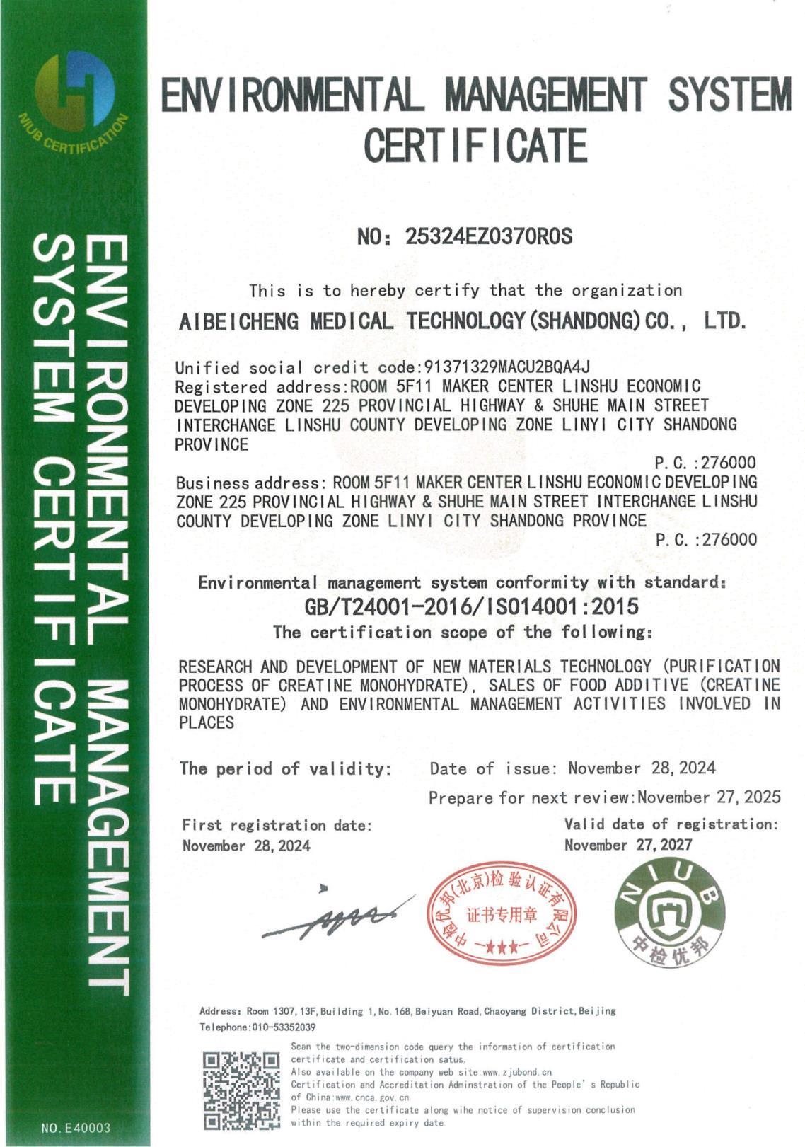 环境管理体系认证证书
